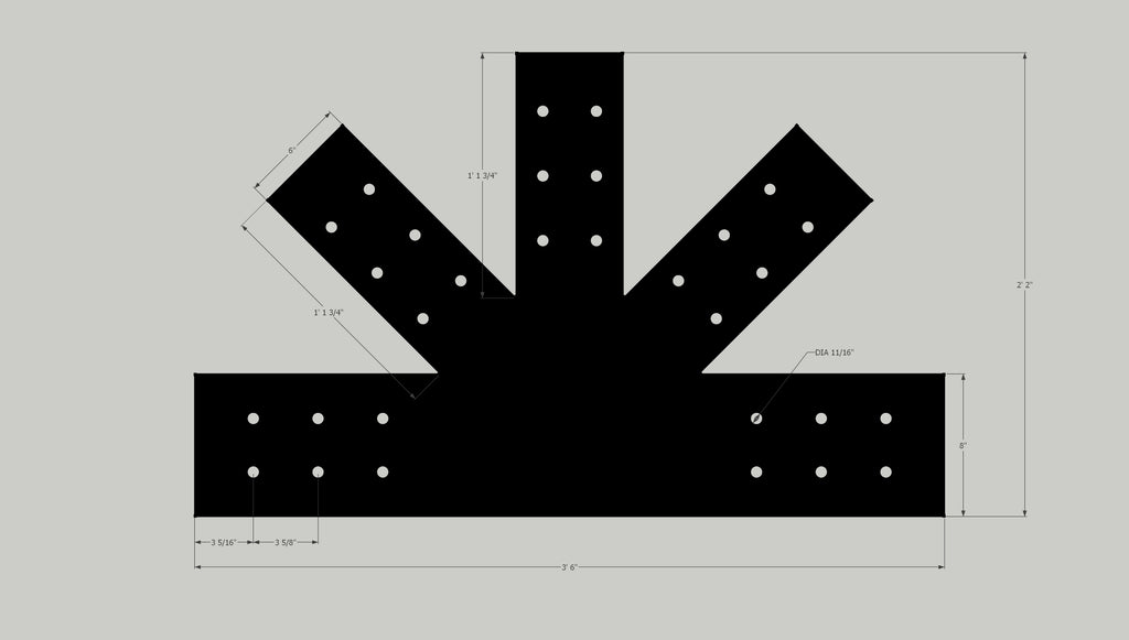 The F8 is a 5-spoke "fan plate". Fan plates are used to connect the bottom tie beam of a truss to two struts and a king post. The F8 has with 8" wide spokes along the tie beam and 6" wide spokes on the king post and struts. Struts radiate out at 45° angles.